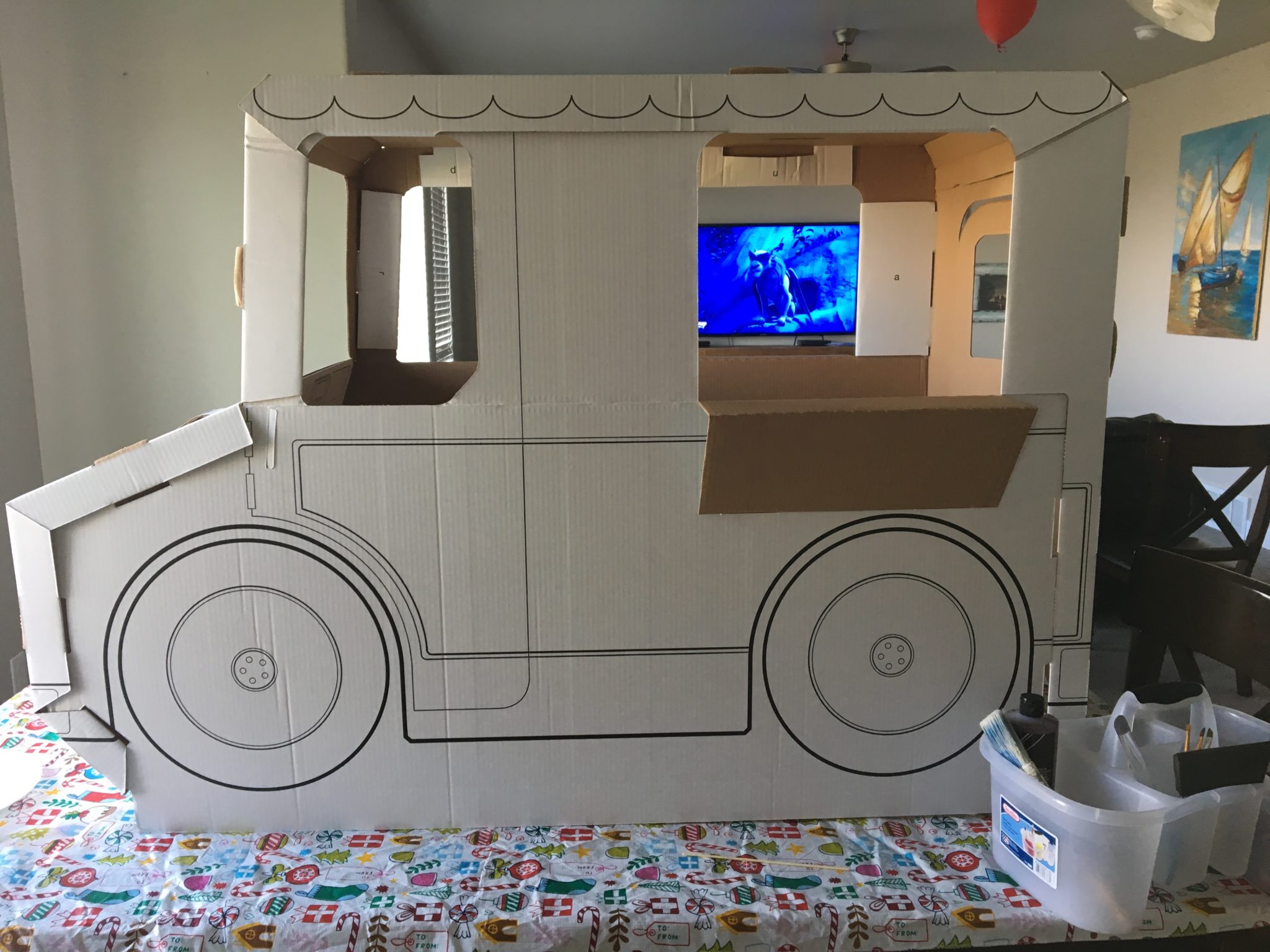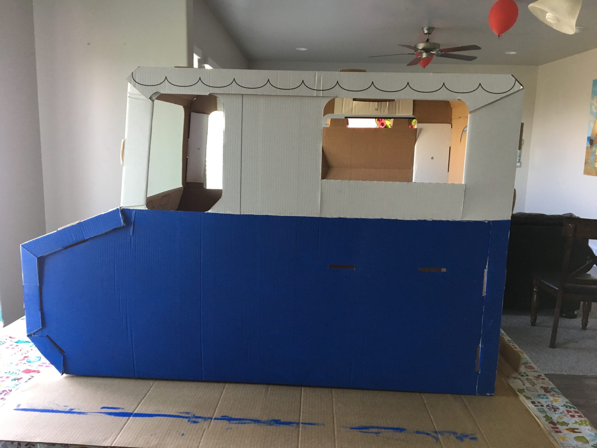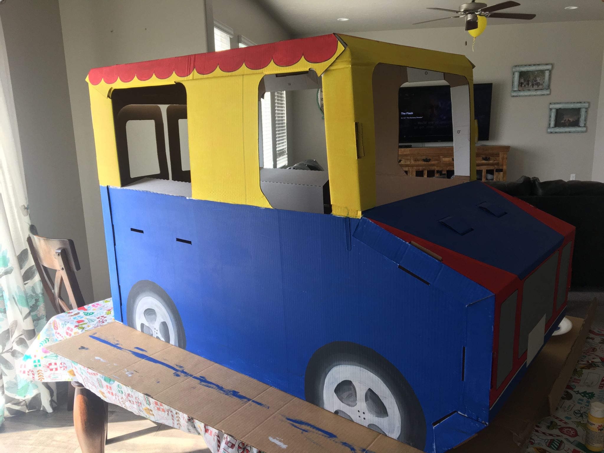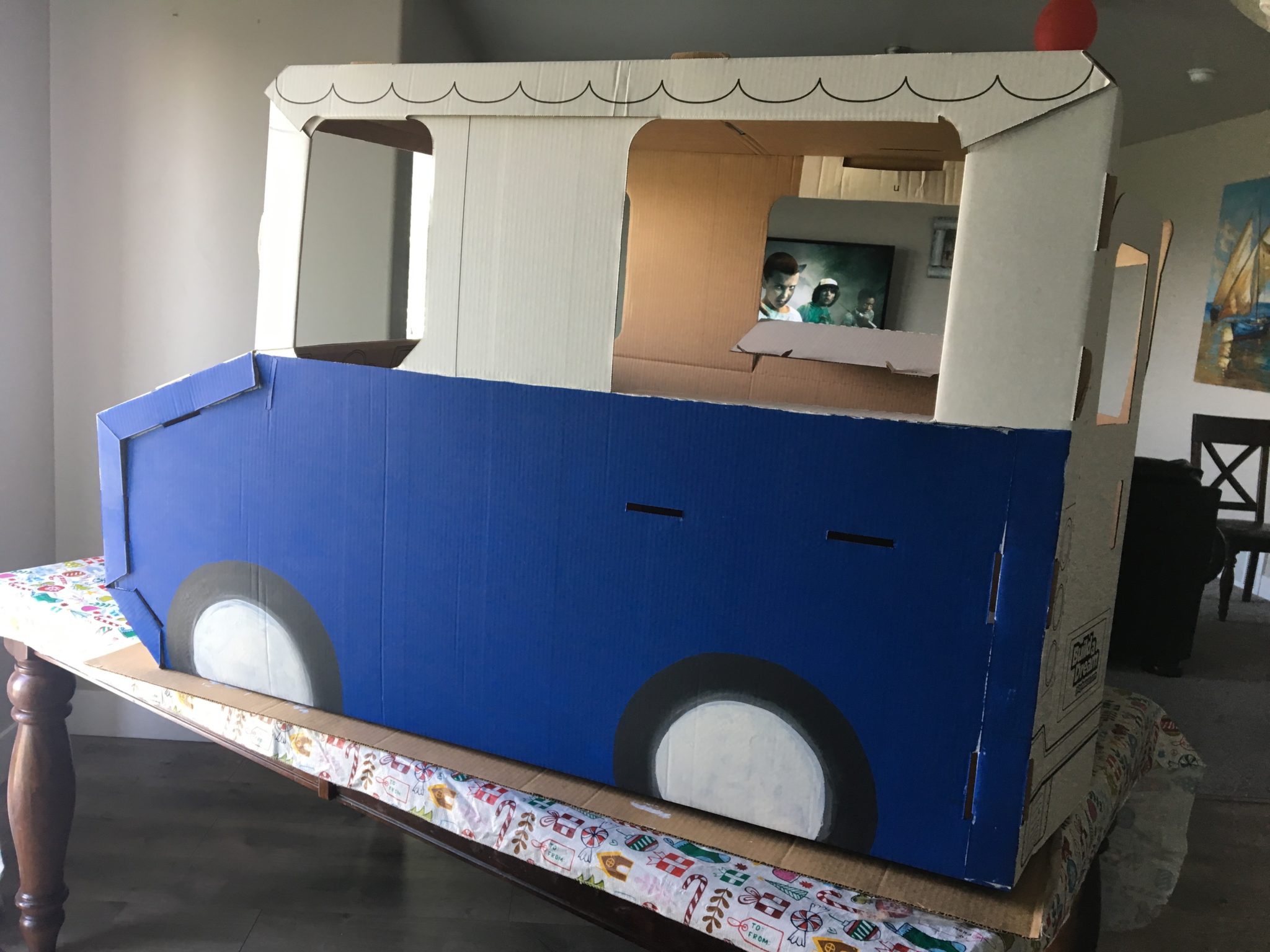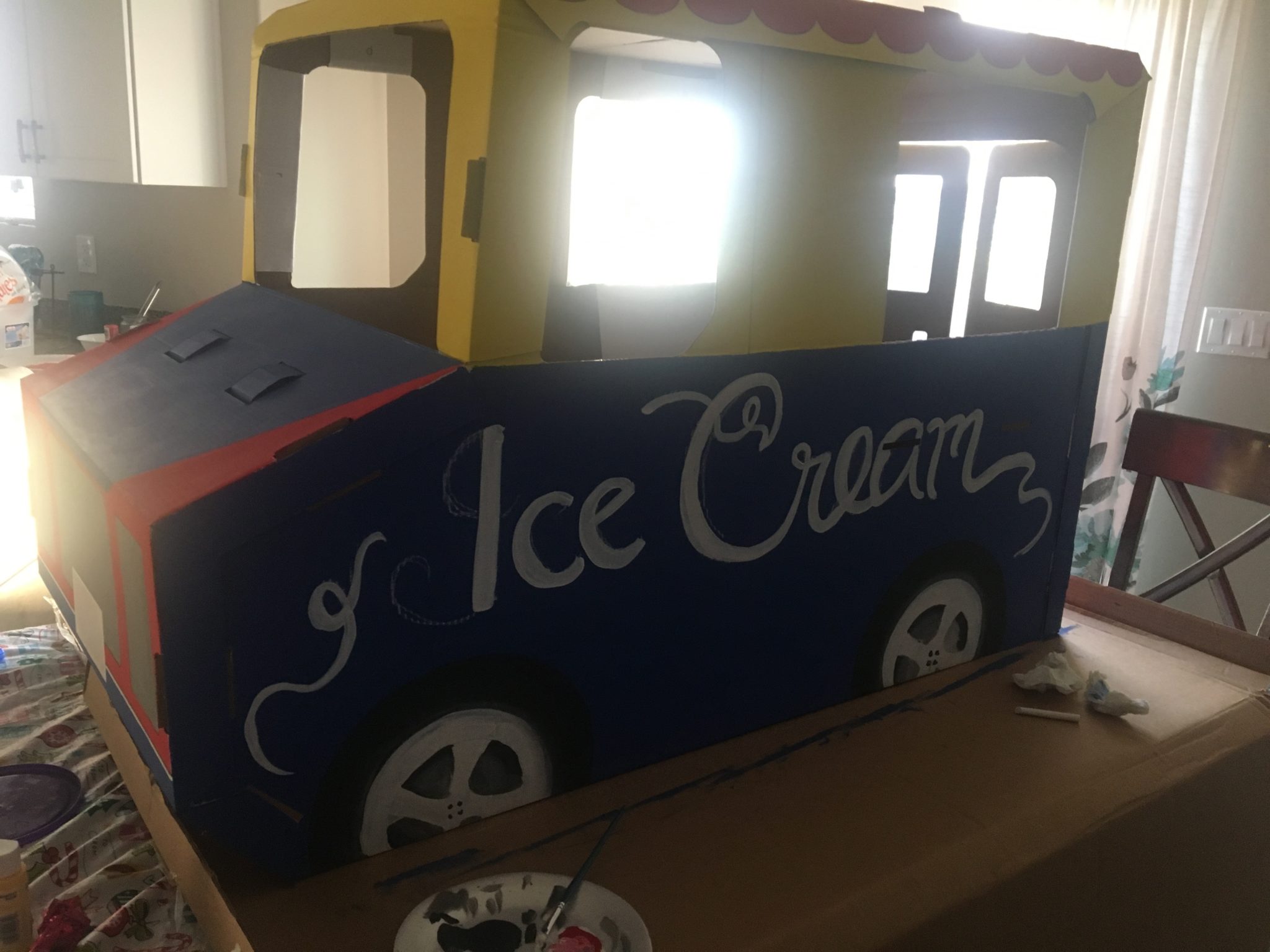 Horsing around with the fully assembled cardboard ice cream truck! 😉