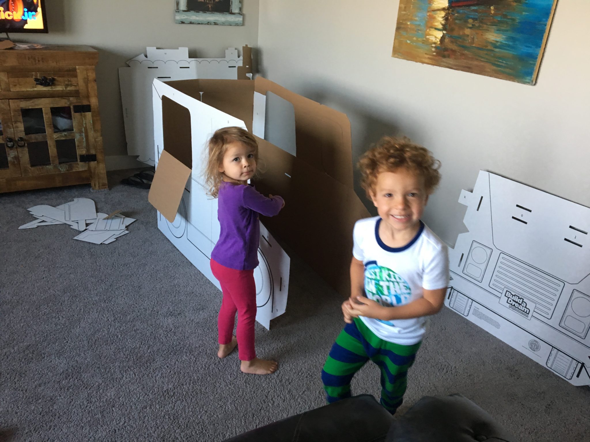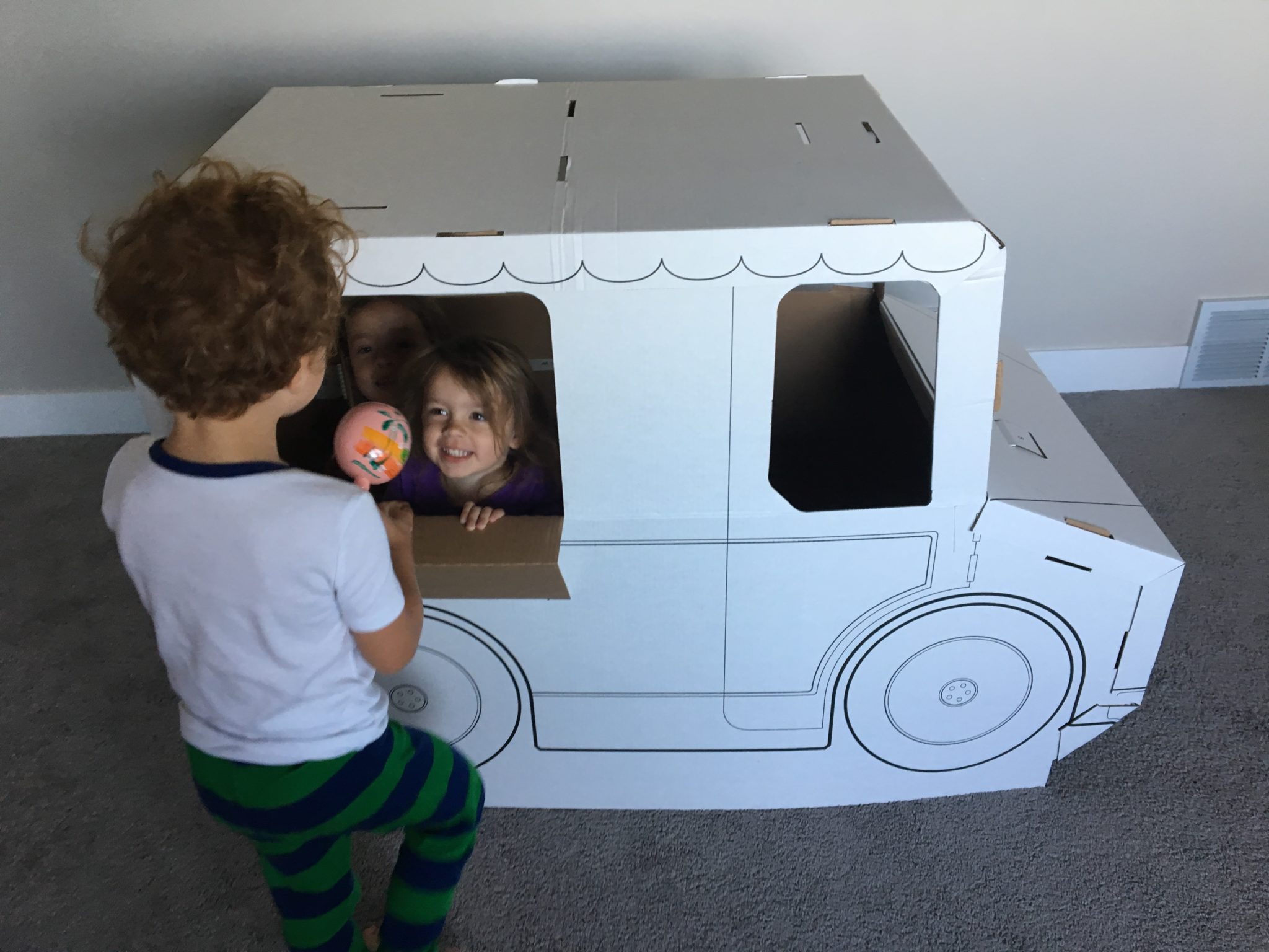 Weston and Bree having fun with the new cardboard ice cream truck!