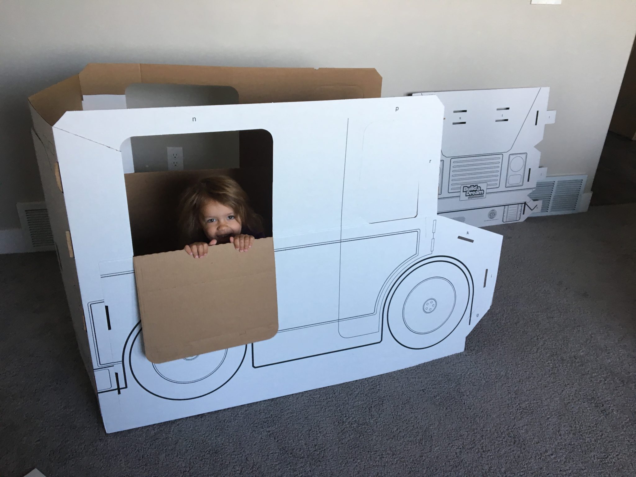 Bree peeking through the window as we assemble the truck.